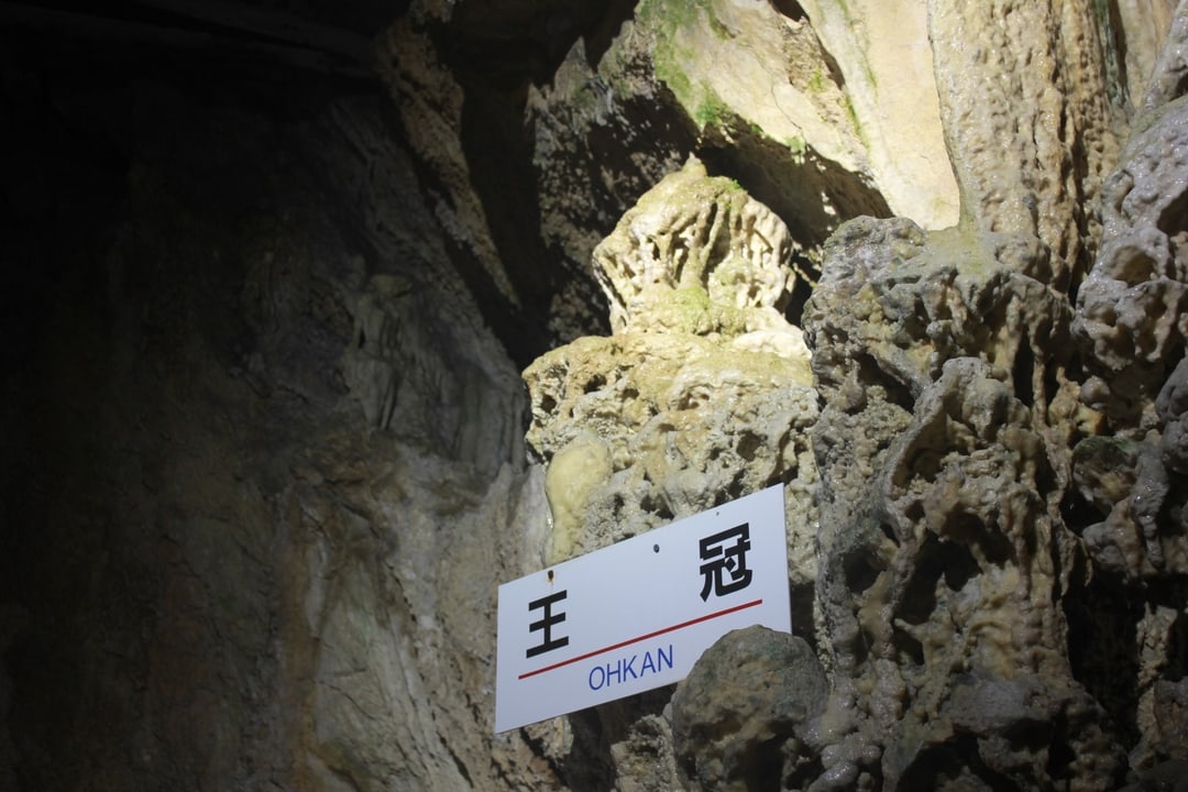 中萩さん:その先を進んで見えてくるのが「王冠」と呼ばれている鍾乳石です。名前の通り王冠のような形の鍾乳石なのですが、なんとこちらは昭和46年にご来場いただいた高松宮殿下によって命名されたのが名前の由来なんです。私たちにとっても思い入れのある鍾乳石になっています。