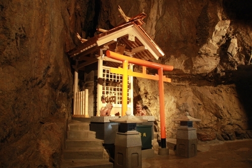 中萩さん:第3洞の出口付近にある神社で、子宝に恵まれるという由来があり、お子さんがほしい方によくお参りいただいています。鍾乳石が男性や女性のシンボルに見えるということをきっかけに建立されました。子宝祈願の絵馬を書いて境内に掛けていただくのですが、お参りした結果子供を授かったという声も多数いただいており、嬉しい限りです。