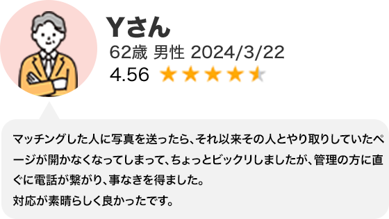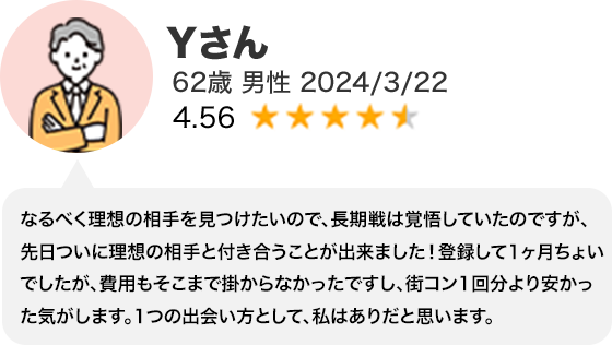 年齢層も他社マッチングアプリに比べて高めで、60代の会員も在籍しています。